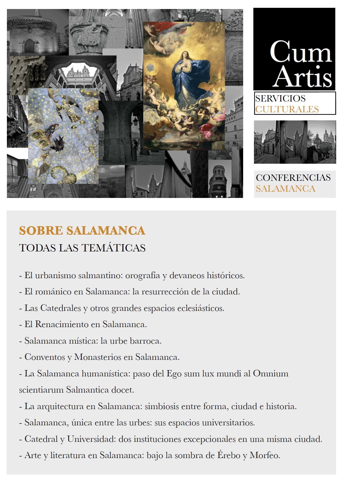 Cum Artis les invita a conocer Salamanca, sus rincones, su arquitectura, su urbanismo, su idiosincrasia, sus secretos, paseando por sus calles y sus joyas artísticas de la mano de profesionales del arte de alta cualificación que Cum Artis os ofrece.