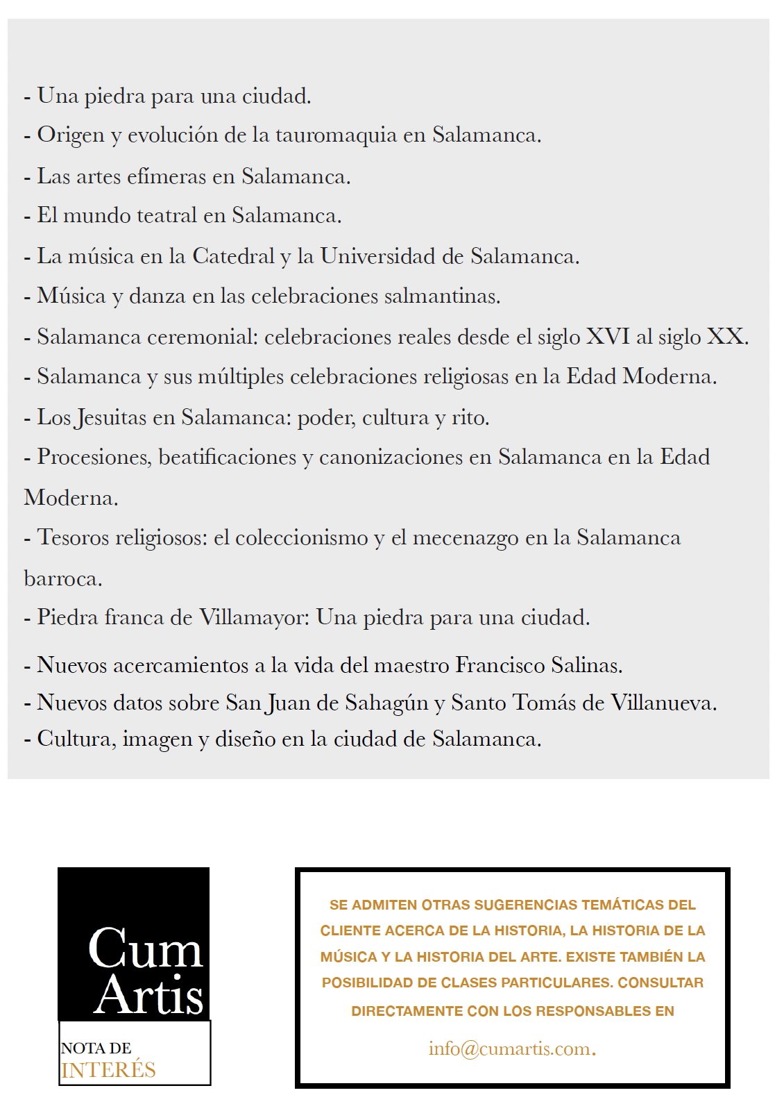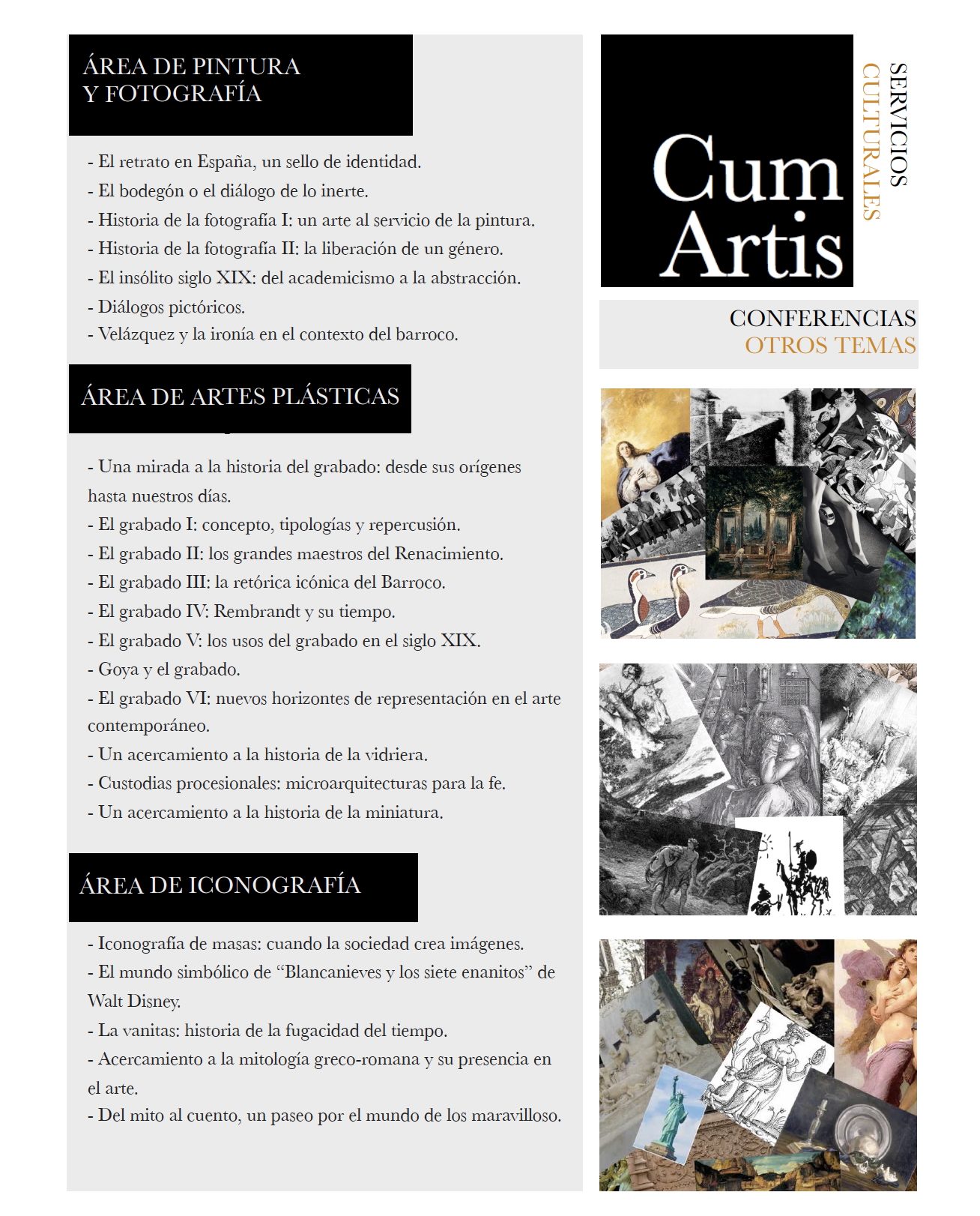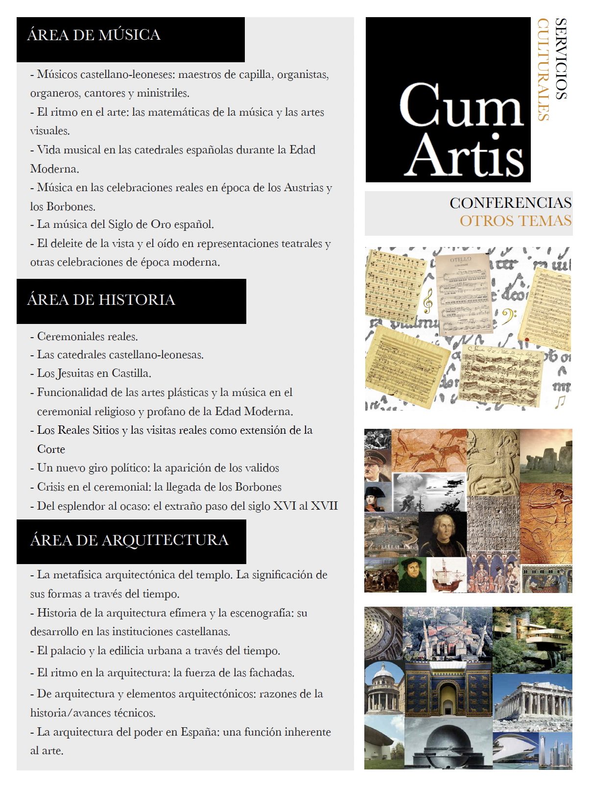 Son tres las áreas principales que Cum Artis quiere ofrecerles: promoción cultural, lecciones magistrales, incluyendo ejemplos al aire libre y conferencias, donde se hace patente los más de veinte años de experiencia docente al más alto nivel en el marco nacional de enseñanzas superiores oficiales.